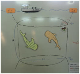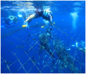 圖:結合箱網漁業與生態旅遊,遊客可與鯨鯊共游,鯨鯊在箱網中亦可以「接力」方式讓互相輪替獲得自由。 | ||