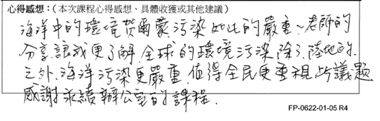 | 綠動計畫2016年第二場名人講座邀請到「海洋勇者」廖敏惠老師,分享她於2011年參與海洋研究探查北太平洋「塑膠濃湯」的經驗,讓我們跟著廖老師一起經歷21天的海上航程! | ||||||||||||||