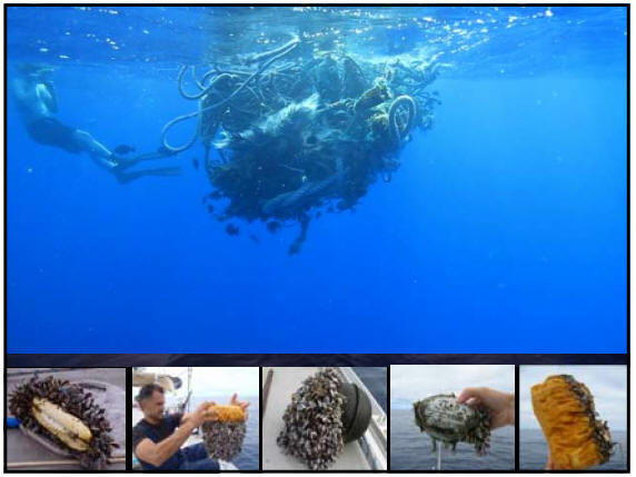 廖敏惠老師與團員們也看到多許令人擔憂的景象。在海面下出現了原本應該在熱帶生活的魚,竟然跟著塑膠箱漂流到中高緯度的海域,想把塑膠箱移開讓魚兒游回大海,牠們也不願意。將研究用的拖網往海面下一拖,也發現一個纏繞成球狀的廢棄漁網,已住滿了各種魚類,也卡著非常多的塑膠垃圾碎片。使用研究瓶從看似乾淨的海水表面取出海水後,才發現裡面漂浮許多塑膠碎片,而有更多的塑膠碎片跟著浮游生物進到魚類、海鳥的肚子裡。