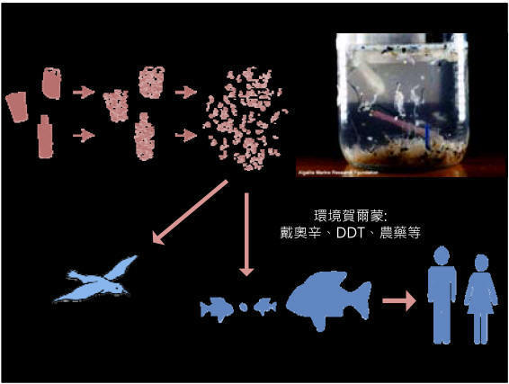 此時不免有人會想:「只要這些魚不要吃進塑膠就好了!」,但事實上魚類並沒有味覺,無法分辨塑膠或是生物,而且牠們的進食方式是不斷吞進海水,讓浮游生物進到體內,不像人類可以用筷子挑出食物與非食物;再者,塑膠碎片長時間在大海浪濤的淘洗下,碎片也愈變愈細碎,幾乎和浮游生物的體型相當,甚至更細小。這些塑膠碎片無法在動物體內分解,隨著小魚吃進塑膠碎片、大魚吃進更多小魚、人類吃掉大魚的食物鏈方式,很有可能就會進到我們人體內。更嚴重的是,這些漂流許久的塑膠碎片,會沾附汙染物及細菌,不僅會對海洋生態平衡帶來負面衝擊,也有可能會對人體帶來危害。 |