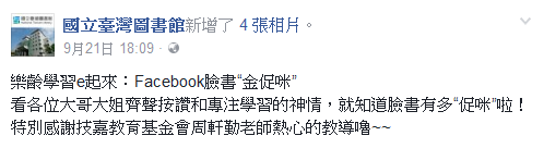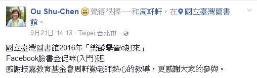 從2012年起~開設Facebook入門班,期透過簡單步驟,讓爸爸媽媽、阿公阿嬤都能輕鬆上手“玩”臉書。