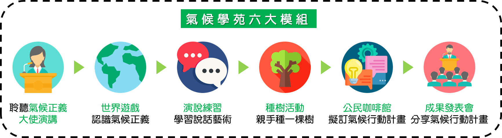 聆聽演講後,小朋友一如既往開始進行一整天的分組學習課程。Plant-for-the-Planet氣候學苑教案設計包括六大模組,各模組學習內容可以參考技嘉之前三場氣候學苑的報導喔! |