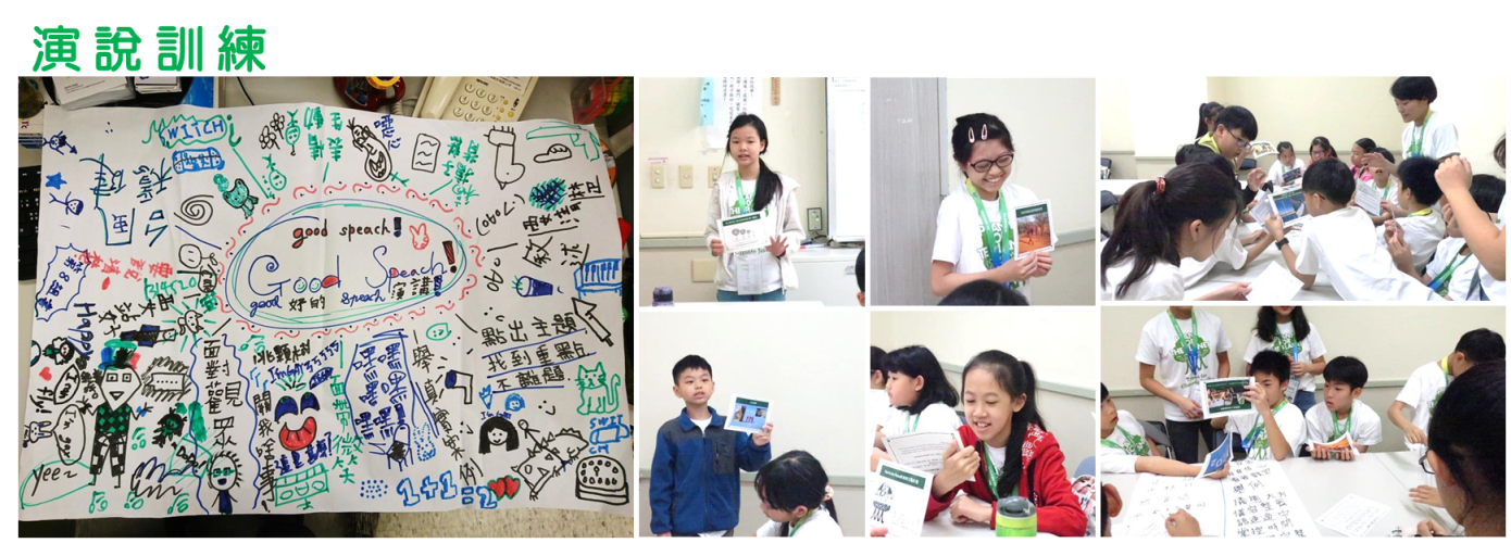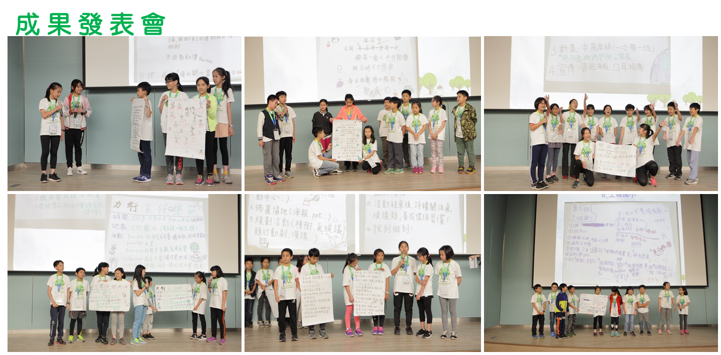 種樹活動之後,就是每一次氣候學苑中最「傷腦筋」的公民咖啡館環節,小朋友要集思廣益討論如何發起一項氣候行動計畫,各校實際擬訂一份計畫書,並在最後的成果發表會上報告。小朋友共擬訂了11份氣候行動計畫書,大部分計畫提出要在校園發起種樹行動,還訂定了種樹的數量和樹種;另外也有提出撿垃圾競賽的想法,還有小朋友提出要在校園傳遞環保知識的方法,包括宣傳減少砍伐樹木、多搭乘大眾交通工具等作法。而且,除了延續推廣Plant-for-the-Planet「停止空談,開始種樹!」(Stop Talking. Start Planting!)強而有力的口號之外,青潭國小小朋友還新增一句口號: |