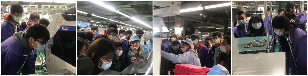 各樓層解說員分組帶學生們直接進入廠區,深入生產線參觀製作過程∼參觀流程分為SMT貼片、DIP插件、TEST測試以及Packing包裝四個流程,每一個流程都需要眾多的成員合力完成,仍何一個環節都不容疏忽,這樣才能保證消費者拿到品質優良的產品。