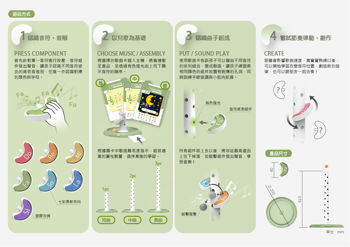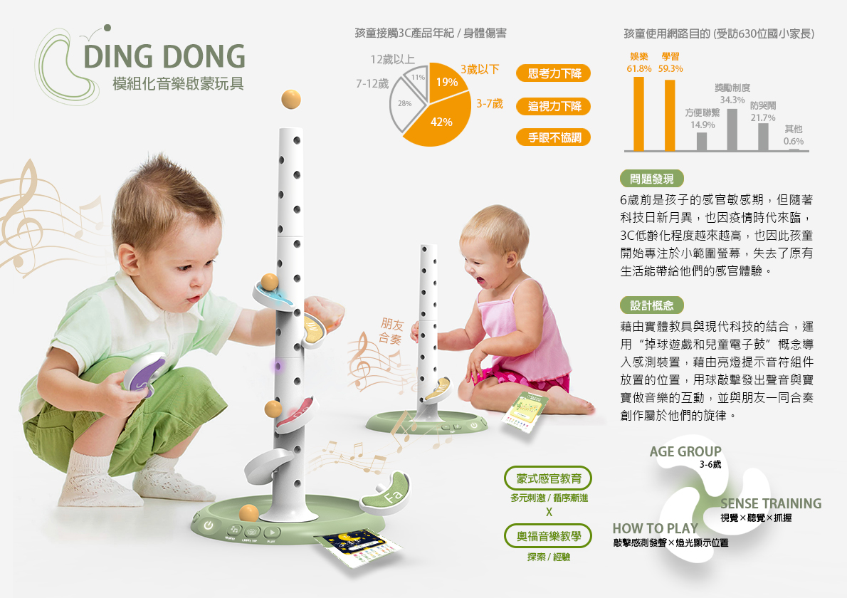 根據兒福聯盟調查指出,3C低齡化程度相當高,有近七成孩子6歲前就開始使用3C,同時也表示並沒有全程陪伴孩子,也因為近年來科技日新月異,以及疫情時代影響,讓孩子開始專注於小範圍螢幕,這不僅會造成孩子腦袋、眼睛、身體四肢永久傷害,還會讓孩子失去原有生活能帶給他們的感官體驗、空間追視訓練。 DING DONG針對3-6歲孩童,設計一款模組化音樂啟蒙玩具融入蒙式感官教育與奧福音樂教學法理念,由現代科技搭配實體遊具,運用聲光吸引寶寶注意、增加樂趣,將“掉球遊戲和兒童電子鼓”概念結合感測裝置,藉由亮燈提示音符組件位置,用球敲擊發出聲音做音樂的互動,並創造屬於他們的旋律,並與朋友一同創作合奏! |