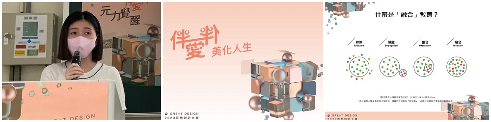 近年來,隨著「融合教育」的推行,「班班有特教生」將是校園日常,身心障礙孩子的一點「不一樣」,被明顯注意,而出現學習、人際溝通、情緒等適應問題,讓看似「融合」的普通班級難以培養出「認識障礙」、「尊重多元」的學生。 明門實業公共事務部許靜怡平面設計師為大家說明美化人生組的主題『伴伴愛』;請參賽者針對此現狀,設計一款產品幫助一般生與特教生彼此同理感受、一起學習正向與接納的價值,展現多元融合的特色,讓不一樣也能成為美好力量!