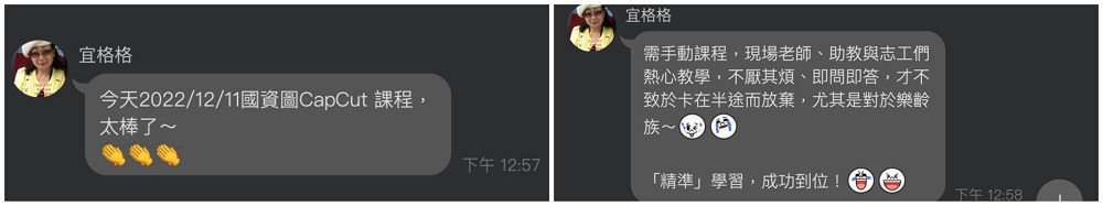 國資圖最後一堂的CapCut影音剪輯完美落幕,長輩們下課後都打鐵趁熱,馬上在練習,大家都希望能夠學會CapCut APP。未來能夠將出遊的照片,編輯成一部生動的影片與朋友分享,期許可以成為朋友中的時尚老人! 課後,長輩們希望明年度技嘉教育基金會還可以繼續來台中上實體課,實體課得學習效果比線上好太多。或是台北有開課,他們也可以高鐵上來上課,長輩們為了學習手機新知,展現出的行動力,讓我們真的很感動!期待明年與國資圖的合作,能夠將更多有趣好玩的課程內容分享給長輩們。