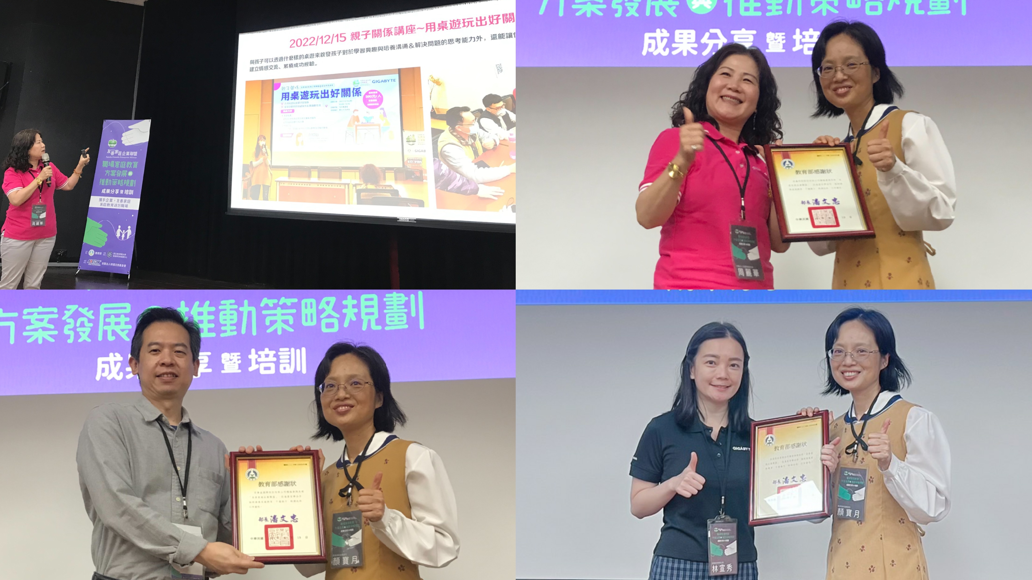 4/19技嘉獲參與「友善家庭企業聯盟」協助推展家庭教育宅配到企業,讓企業員工在公司即可獲親職教育、婚姻教育、代間教育等家庭教育資源。有技嘉、研揚、技宸、百事益、勤誠興業、東碩科技等11家企業獲教育部頒感謝狀,並代表分享在企業推動家庭教育的做法及方式。 深深覺得家庭經營是學校沒教,但需要關注,用心學習的議題。鄧老師藉由桌遊,讓大家在遊戲互動中讓溝通變輕鬆。同仁分享:父母學是一門陪伴孩子成長的必修學分,技嘉幸福加油站的講座很實用,希望未來能有更多的相關課程。大家的分享讓新手父母們有家庭經營路上不孤單,可參考不同的溝通方法很棒! |