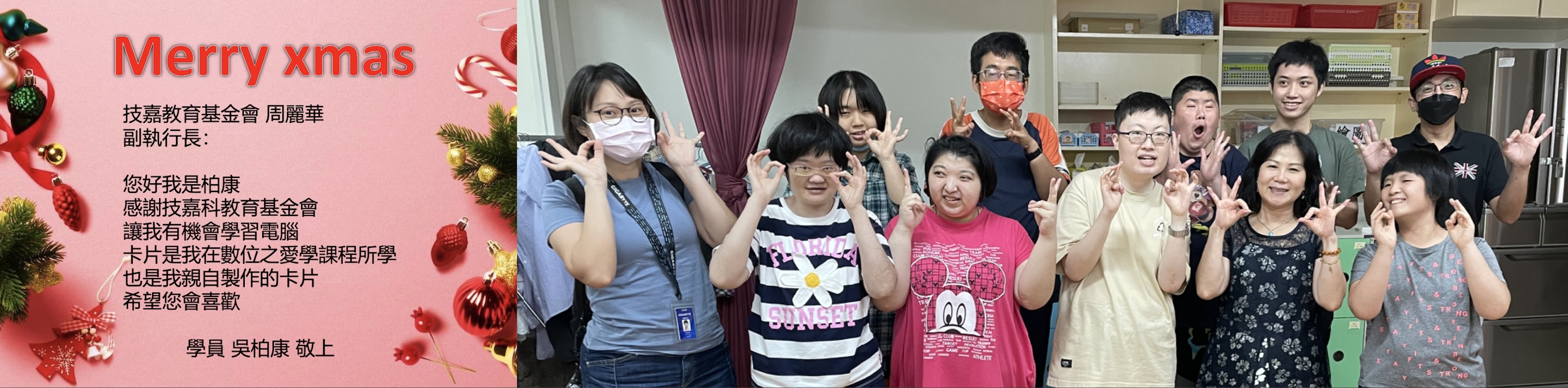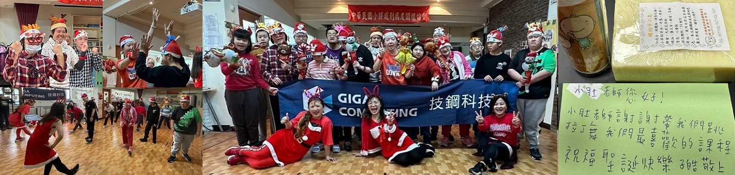 璀璨耀眼,共度歡樂聖誕派對!技嘉子公司~技鋼科技超強Zumba團隊,不僅在企業家庭日正式出道,公益回饋社會不遺餘力,12/25聖誕節當天~來到新店在地的小胖威利小作所,帶來許多耀眼的聖誕飾品分享給小胖們,大家挑選自己的特色聖誕裝飾。從閃亮亮的星星到可爱的聖诞老人帽,充满濃濃的聖誕氣氛。小胖們在志工老師的帶領下跳起了歡樂輕快的聖誕舞曲,高興地唱著聖誕歌,現場洋溢着歡樂的笑聲,大家共同創造了一段美好的回憶! 暖心的聖誕卡和小禮物:小胖們在派對結束後還為每位志工老師寫了聖誕卡並親自送上親手做的手工皂,傳遞着聖誕的温暖和感恩的心,臨別時小胖們還不忘吩咐:「老師你們要好好保重身體,不能感冒喔!下次還要來帶我們跳Zumba~跳舞好好玩喔!」技鋼講師已經為小胖們安排一系列每月一次的固定場次,繼續分享Zumba的熱情! |