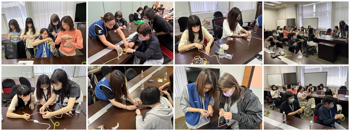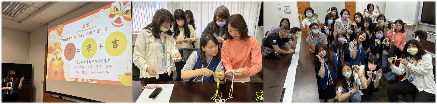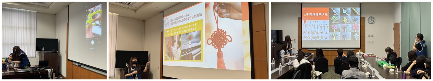 課程由韓定芳&吳孟儒講師細心介紹中國結的歷史與文化背景,接著一步步帶領學員體驗手作的魅力,從象徵豐收與團結的「小麥結」、可愛造型的「南瓜結」、功能性強的「瓶口結」、代表平安與祝福的「御守結」,到形似古代樂器、線條優雅的「琵琶結」,每一種結都有其獨特的寓意與用途,學員們專注地一針一線穿引,在實作中體會到傳統工藝的細膩與溫度。 |
