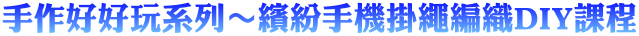 《手機掛繩編織DIY課程》再度開課囉∼還記得之前大受歡迎的3/18繽紛手機掛繩編織DIY課程嗎?這次我們於7/10又加開了一堂,一樣邀請到同樣熱愛手工藝、用堅持走過人生低潮的「江珮如」老師來教學!不一樣的是,這堂課老師準備了不一樣的設計,讓大家在編織掛繩的同時,也能玩出不同的變化和小巧思,課程中,大家一樣可以挑選自己喜歡的包芯棉線配色,動手把實用又美觀的手機掛繩編織完成∼