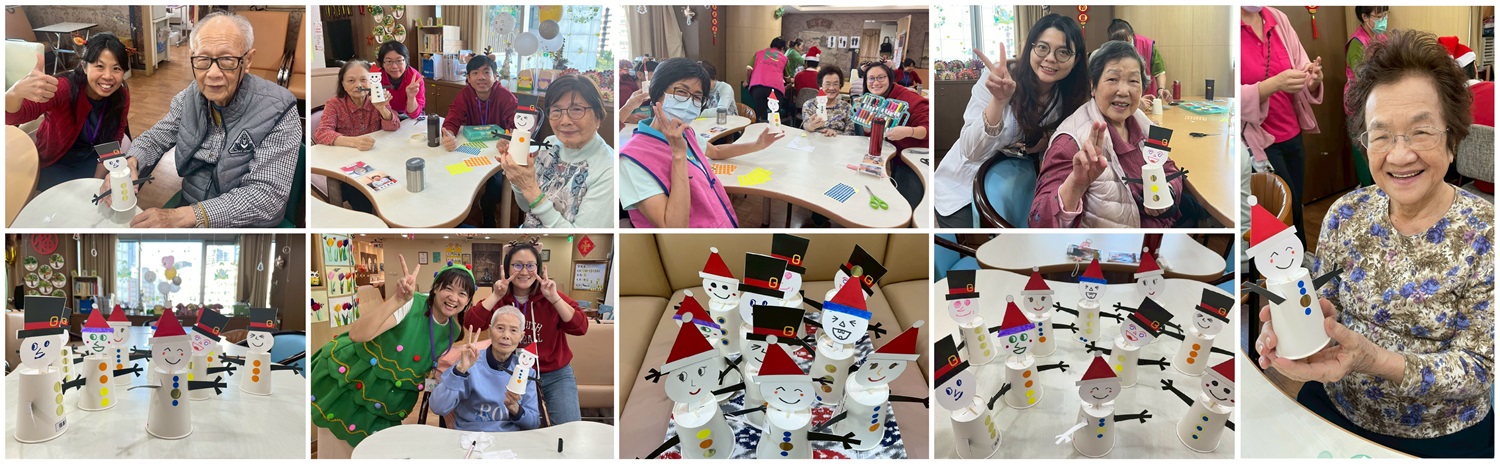 在向大家破冰自我介紹後,帶著長輩們製作聖誕雪人搖搖杯,鼓勵大家發揮創意,剪貼後親手繪製屬於自己的雪人,長輩們都很滿意自己的作品;手作完成後由基金會設計帶動跳,隨著聖誕鈴聲的歌曲,大家一起唱唱跳跳,充滿笑容與活力∼