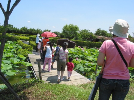 蓮園賞蓮 ~ 蓮花生態解說接著我們來到了蓮花池,有許多各種不同的蓮花,還可以看到花朵中央倒圓錐形的花托