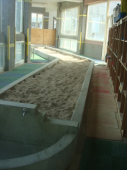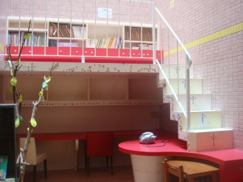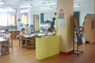 教室與教室之間僅用走道隔開,到處都看的到學習的角落,老師們則以小組方式專案教學,