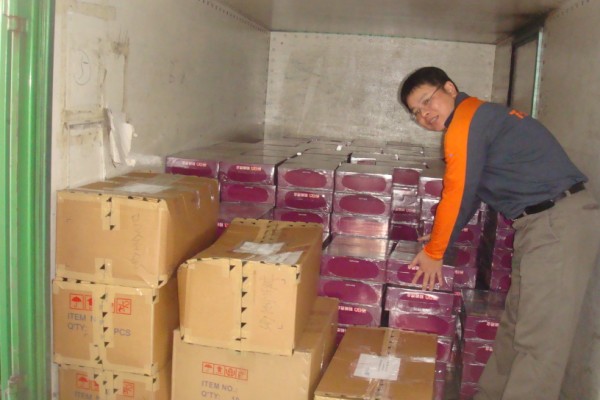 1/15早上,由貨運將720箱的紫米薏仁粥以及720個環保袋運往新店市公所 |
