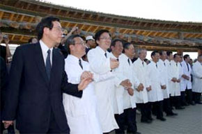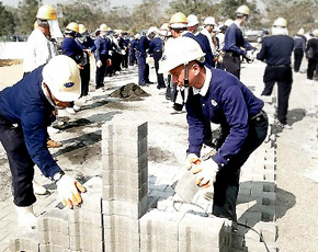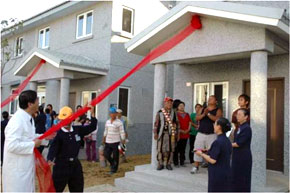 在高雄縣杉林大愛園區,那瑪夏鄉民族村的村民,在村長和長老的帶領下來到園區當志工鋪設連鎖磚,他們說看到未來的家就快完工,以後不用再擔心土石流,所以主動來當志工為家園努力 ,鄉親們都說這是用微笑所蓋的房子。 |