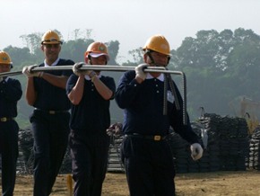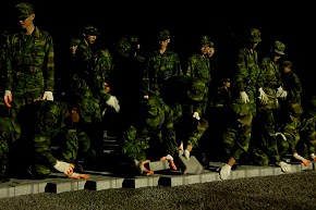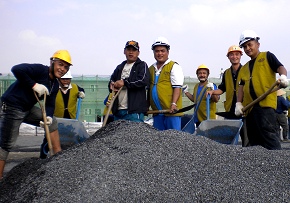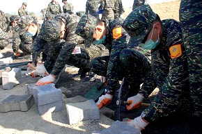海軍陸戰隊弟兄,分為日夜班協助鋪設連鎖磚,從白天迄黑夜。 |