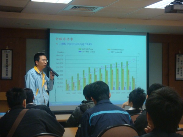 一開始由品保部門阿貴課長歡迎同學們的到來 並向同學們介紹技嘉科技及主機板在全球的市佔率