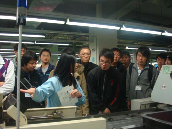 在參觀產線時,同學們認真的聽著阿貴課長的介紹, 尤其對並對各式各樣的機器感到好奇,頻頻向阿貴課長請教機器的功能及用途 而阿貴課長也詳細的回答同學們所發問的問題 |