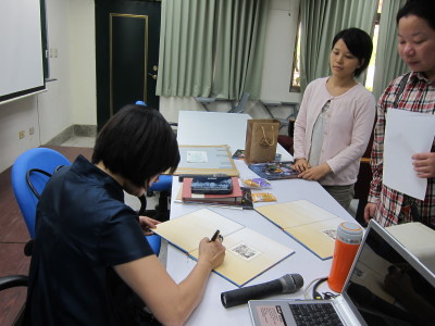 最後老師還分享另一本繪本的畫作,結束前大家拿出手上的繪本等著老師簽名,
