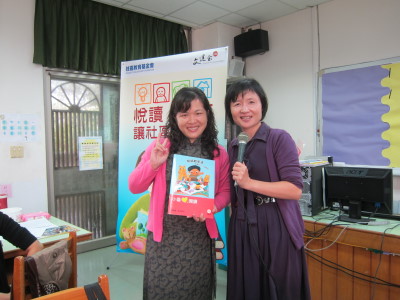 現場示範朗讀及說故事的技巧,最後、老師還贈書給示範說故事的故事媽媽,