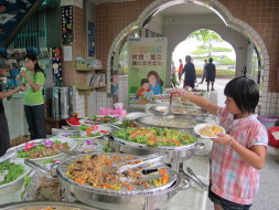 長長的走廊上已擺滿各式各樣的美食,兩校的老師、家長和同學開心地拿起盤子,