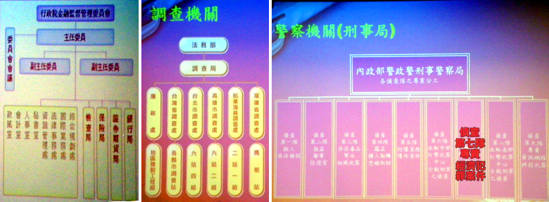 周檢察官和大家分享較為經鬆的話題,他提及十幾年前偵辦金融犯罪案件往往承辦人員並不具備相關的金融專業知識,是以前往扣押犯罪嫌疑人的電腦設備時,承辦人員只抱走最大件的電腦設備-螢幕,卻沒有扣押電腦主機而鬧出的真實笑話。另外還有早期某知名綜藝主持人傳出早已結婚生子的影劇八卦,更有檢察官好奇利用法務部的對外連線戶役政系統查詢 事情真相而遭懲處。 雖然台灣成立許多的機構單位為查緝與防治金融犯罪做努力,也於97年首度在司法事務官特考中增加了財經相關的考試科目,但於金融犯罪的偵審上仍面臨到專業人力的不足、公訴檢察官不受重視、以及法官對於專業知識之進修不具誘因的困境。雖然種種條件上的限制以及相關法規赴之闕如的問題都有待克服。 |