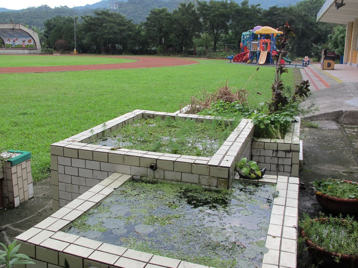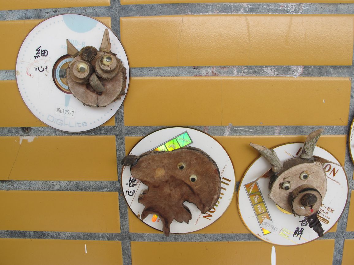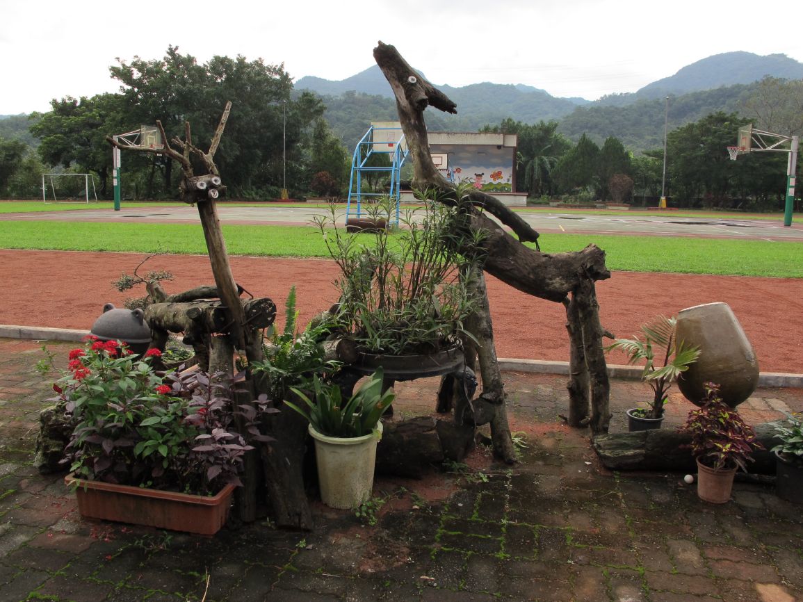 排列整齊的雨傘,許許多多用木頭做成組成的動物,真是個與大自然融合的美麗小學!