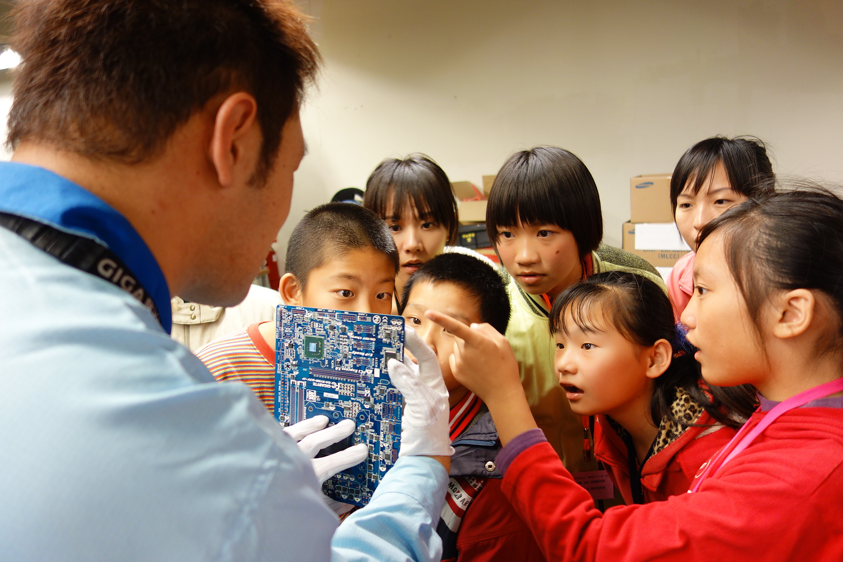 科教館愛迪生營的小朋友們來到技嘉南平廠參訪囉!大家都有用過電腦吧?!那你們知道主機板長什麼樣子嗎?主機板的功能又是什麼?上面又有哪些重要的小零件呢?讓我們跟著軒勤老師來一起探索電腦構造的秘密吧!